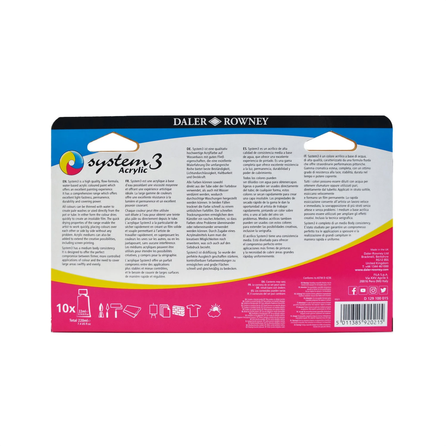 Daler-Rowney System3 Acrylics are versatile, water-based colours made from high-quality pigments. System3 Acrylic colours are lightfast, permanent (ranking from 3 to 4 stars for most of the colours), opaque (10 opaque and 20 semi-opaque colours), flexible, and quick-drying, making them suitable for applications on paper, artboard, canvas, wood, metal, brick etc.