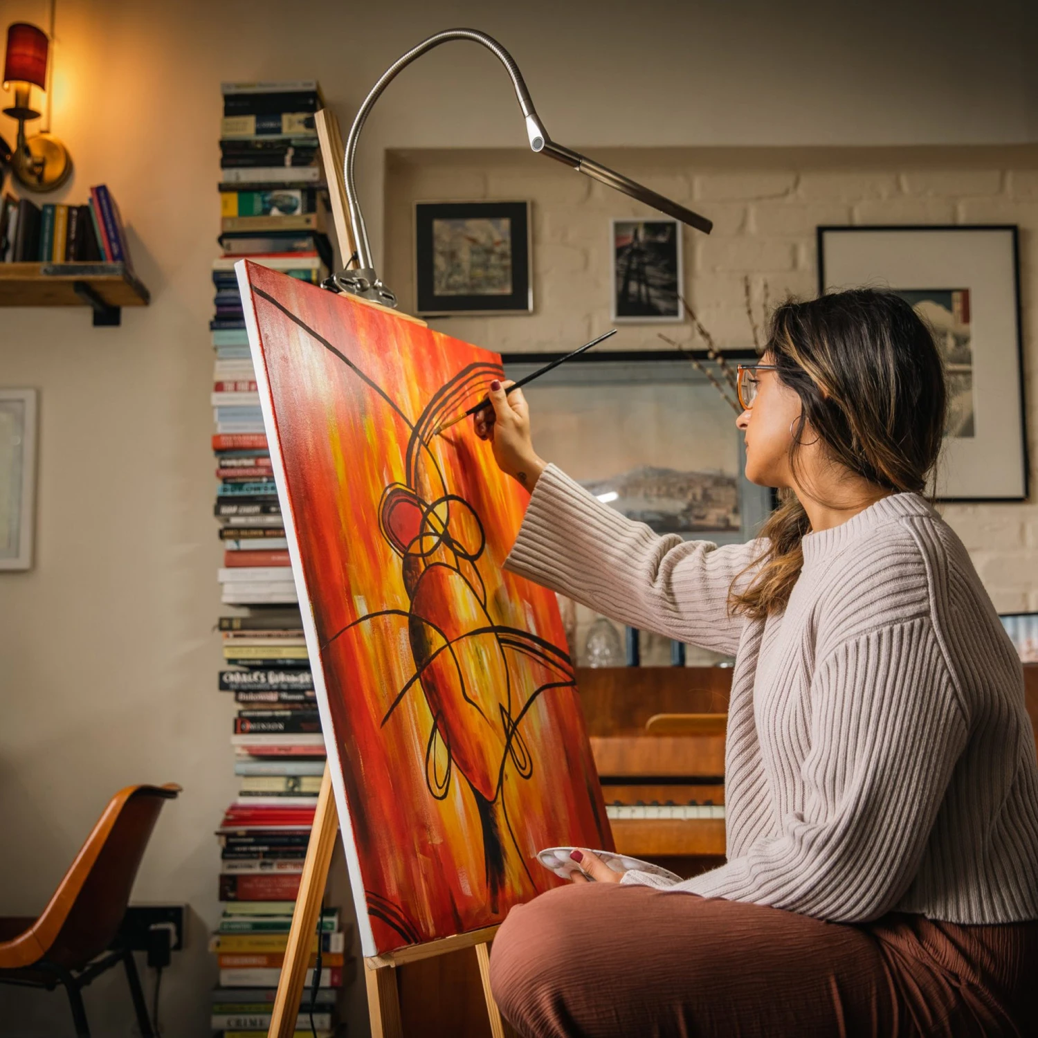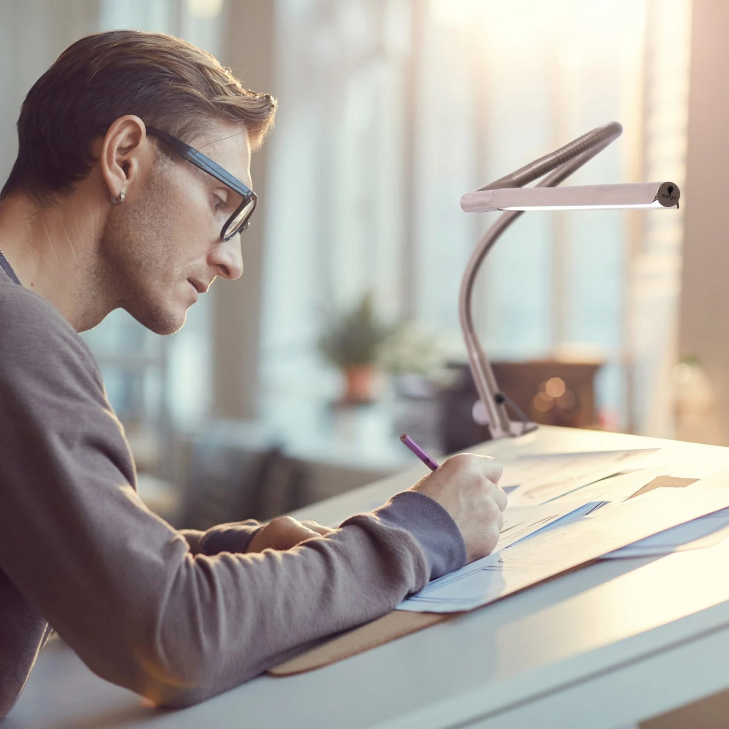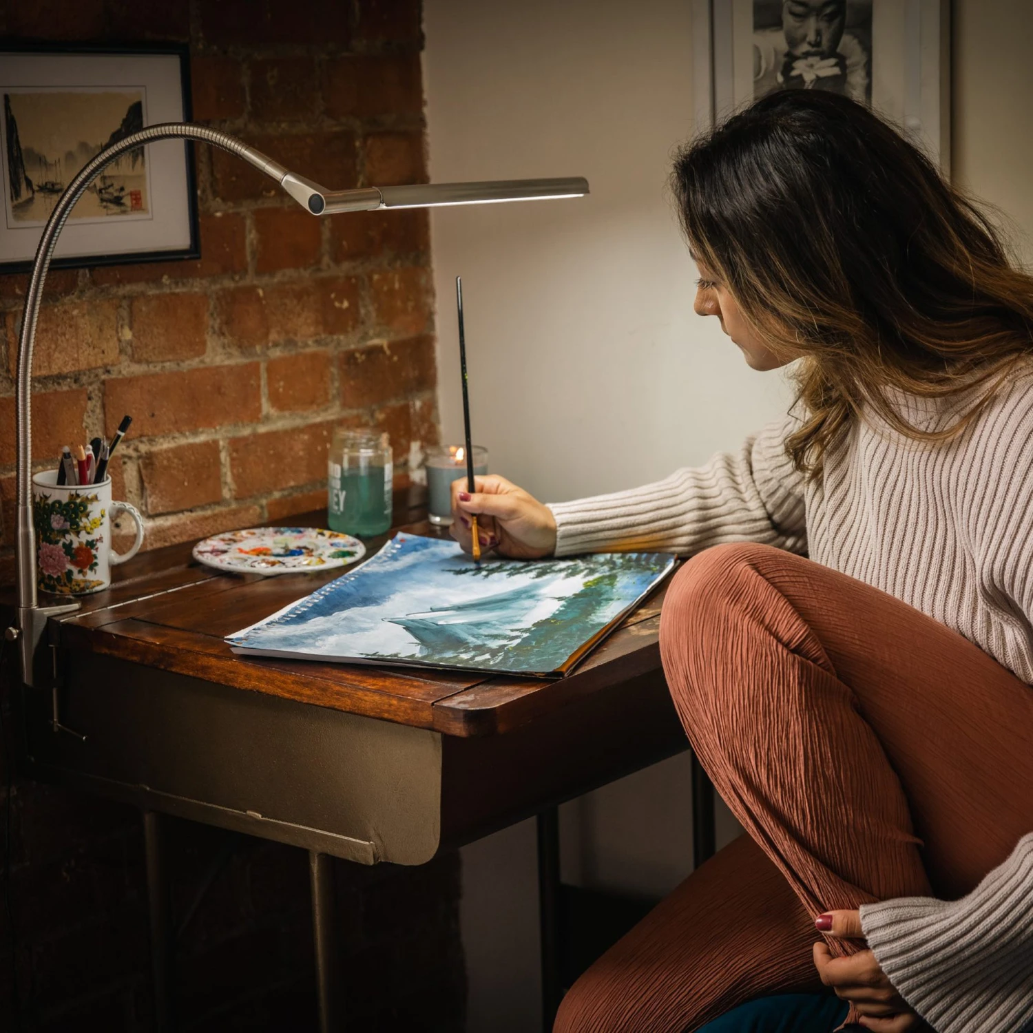 The only lamp on the market that was truly designed for mounting on an easel, the Techne can also be attached to a drafting table, drawing board or a work bench. It comes with a universal easel metal clamp and a G-clamp for moving it from your easel to your drawing station. The arm allows a 360° shade rotation and 320° swivel. When working on an easel or at a table the Techne lets you direct the light to the specific area you are working on – for close-up precision and attention to detail. Awaken the artist in you!