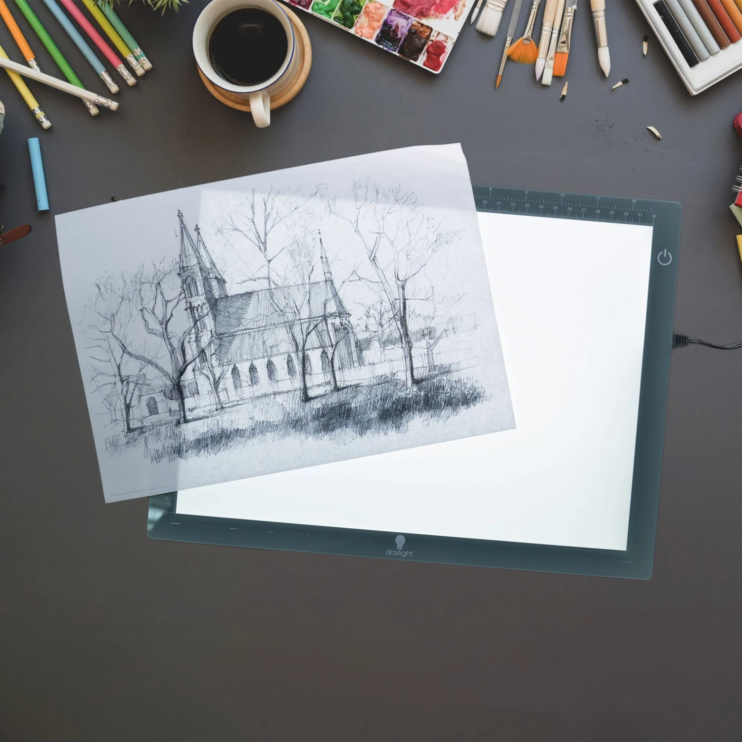 Ultra bright, ultra slim, ultra light, the Daylight Wafer lightbox is your must have tool for tracing, on paper or fabric. LED lightbox for an even brightness from edge to edge, the light is dimmable to suit paper weight and fabric thickness and include a handy marking guide on the sides (inches and centimetres).