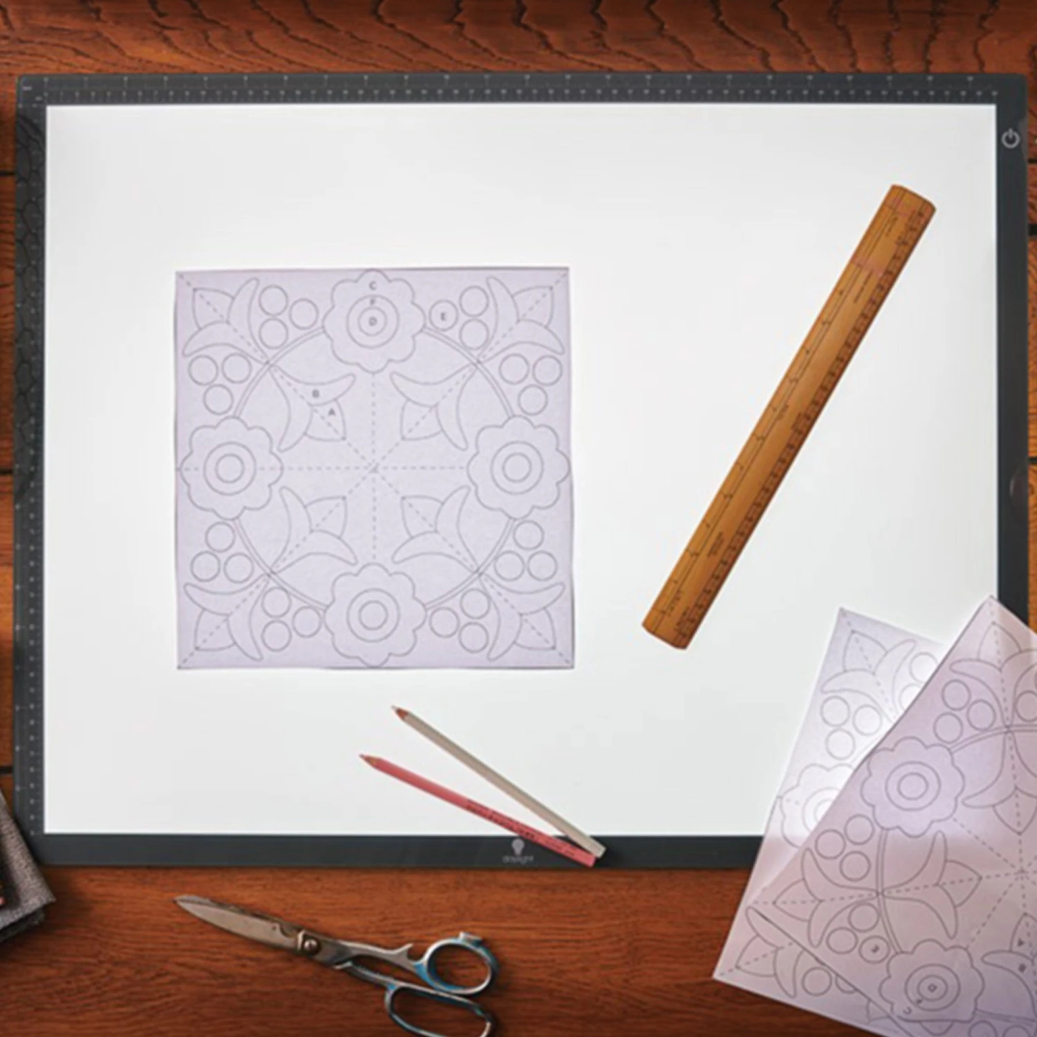 Ultra bright, ultra slim, ultra light, the Daylight Wafer lightbox is your must have tool for tracing, on paper or fabric. LED lightbox for an even brightness from edge to edge, the light is dimmable to suit paper weight and fabric thickness and include a handy marking guide on the sides (inches and centimetres).