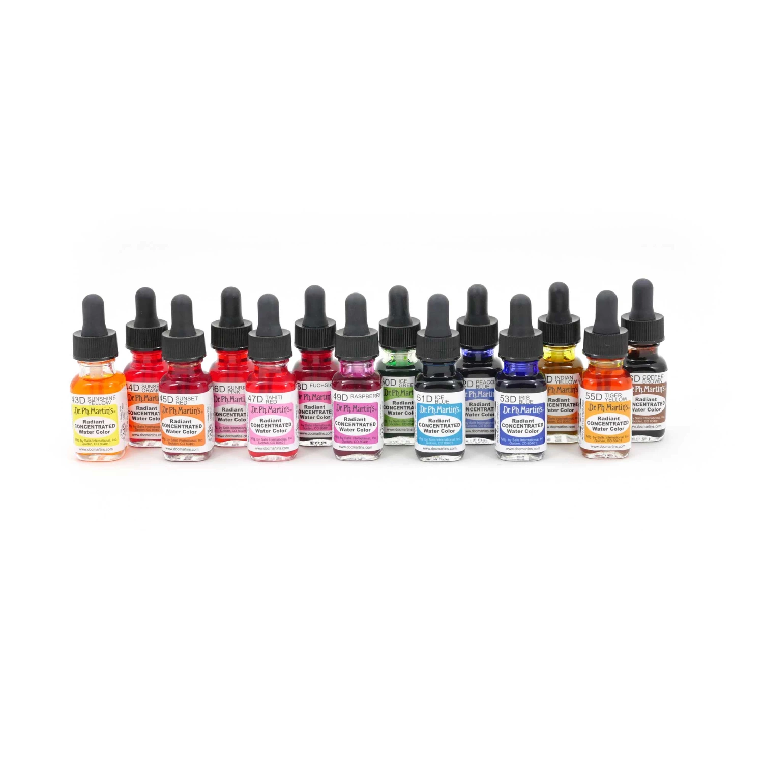 Dr. Ph. Martin’s Radiant Concentrated Water Colour is produced in an extremely concentrated form to achieve the greatest possible brilliance. Each liquid colour comes in an iconic 0.5 oz (15 ml) glass bottle package with its own eyedropper.