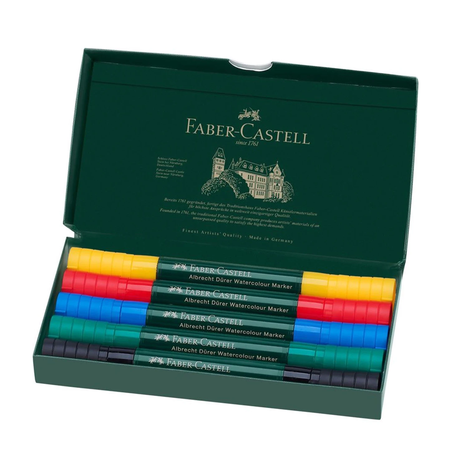 Albrecht Dürer Watercolour Markers are a high-quality drawing instrument that supports both spontaneous sketching and artistic watercolour painting. The water-based ink is always ready for use and can also be completely washed out with water. The versatility of this marker is especially convincing when traveling. Those who like to hold onto impressions while on the go will be delighted to be able to turn to this pen.