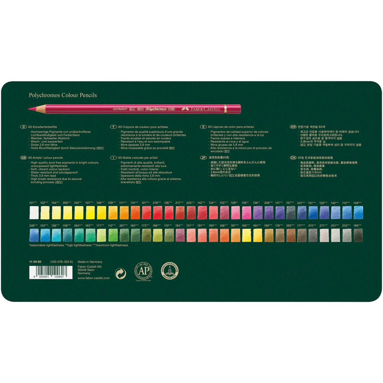 This extensive set contains 60 high quality Faber-Castell Polychromos Artists’ Pencils enclosed in a convenient and easily portable tin.