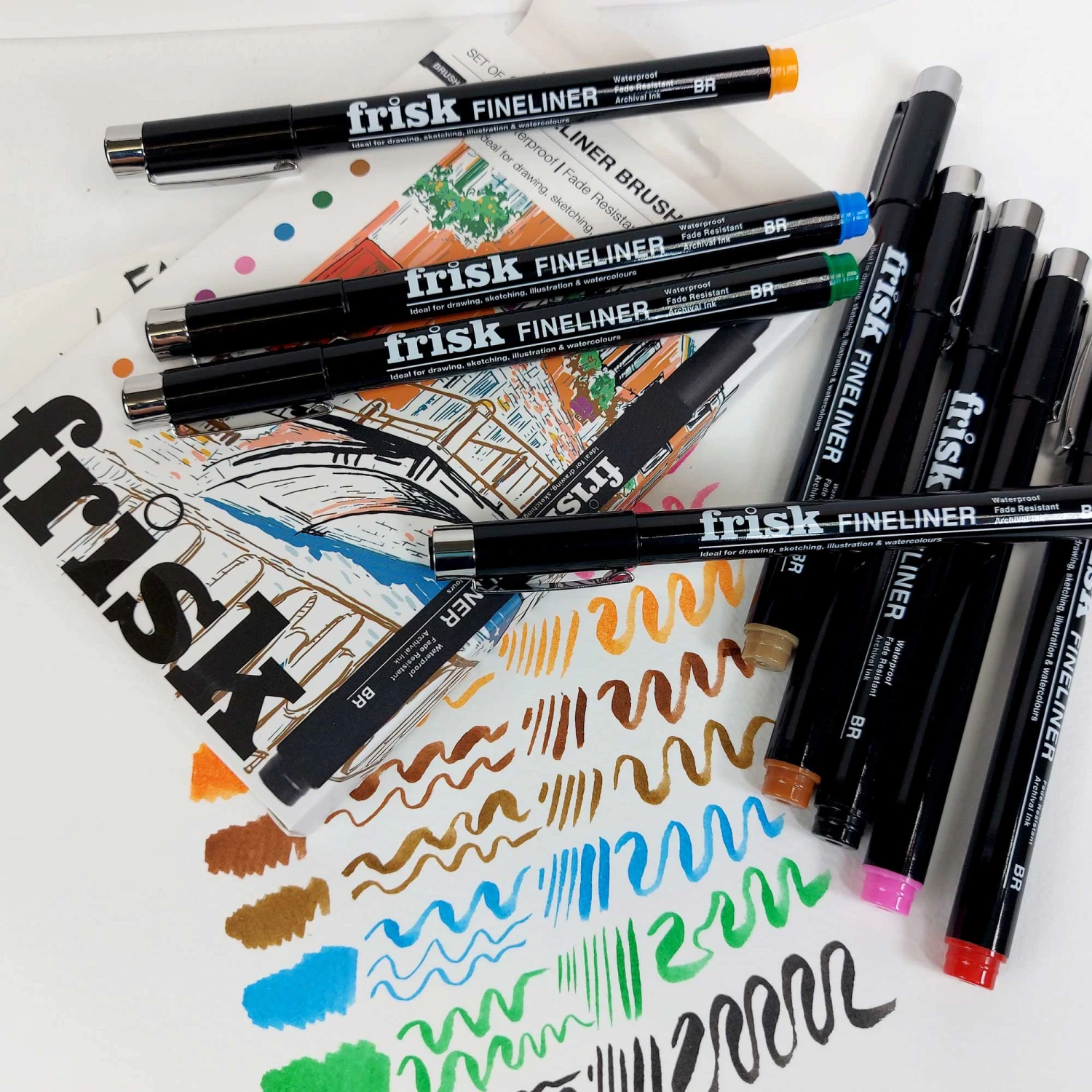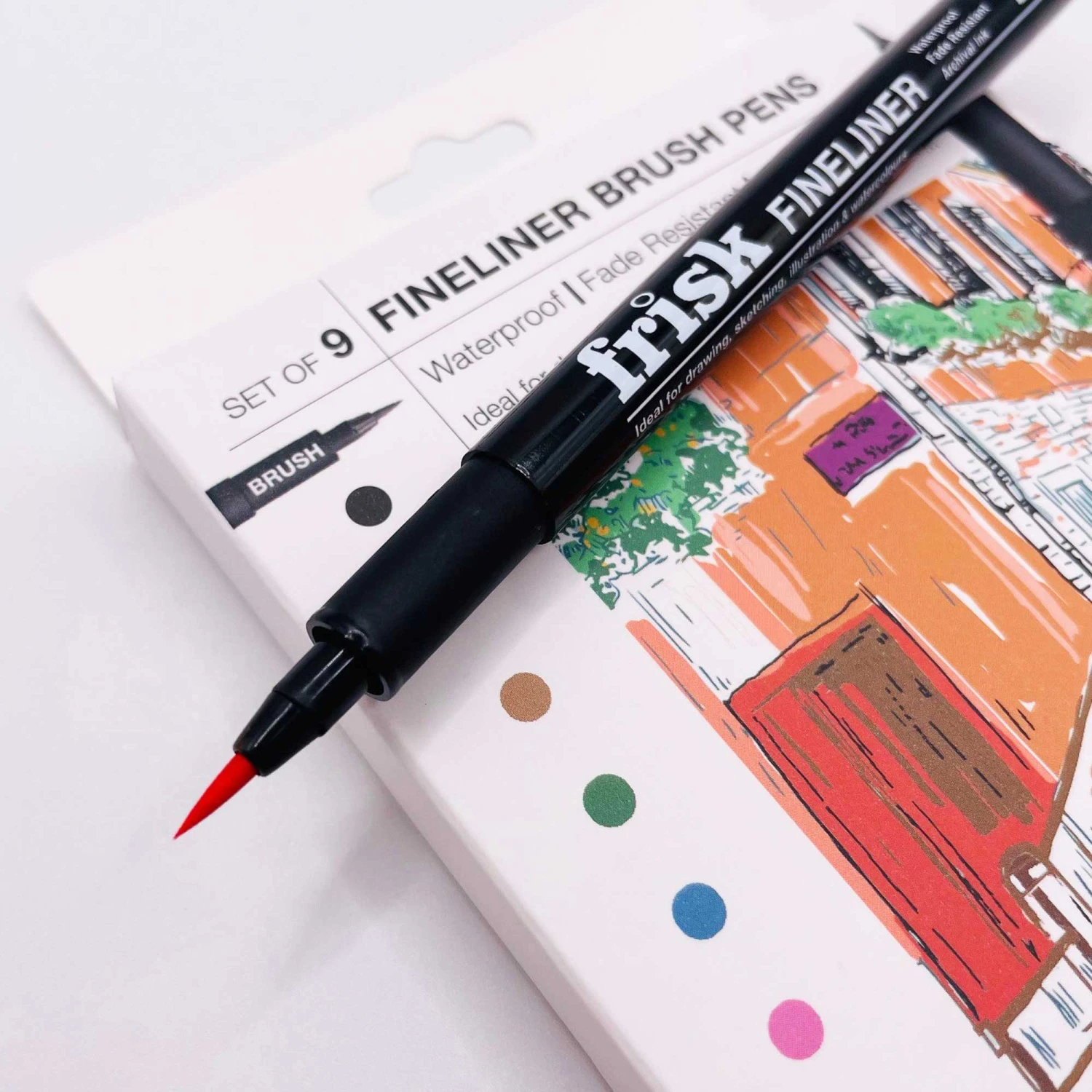 An assorted set of 9 Frisk Coloured Fineliner Brush Pens, ideal for drawing, sketching, watercolours, and more. Their felt brush tip allows for an incredible variety of line widths to be used, from the smallest of details to colouring large swaths of an image.