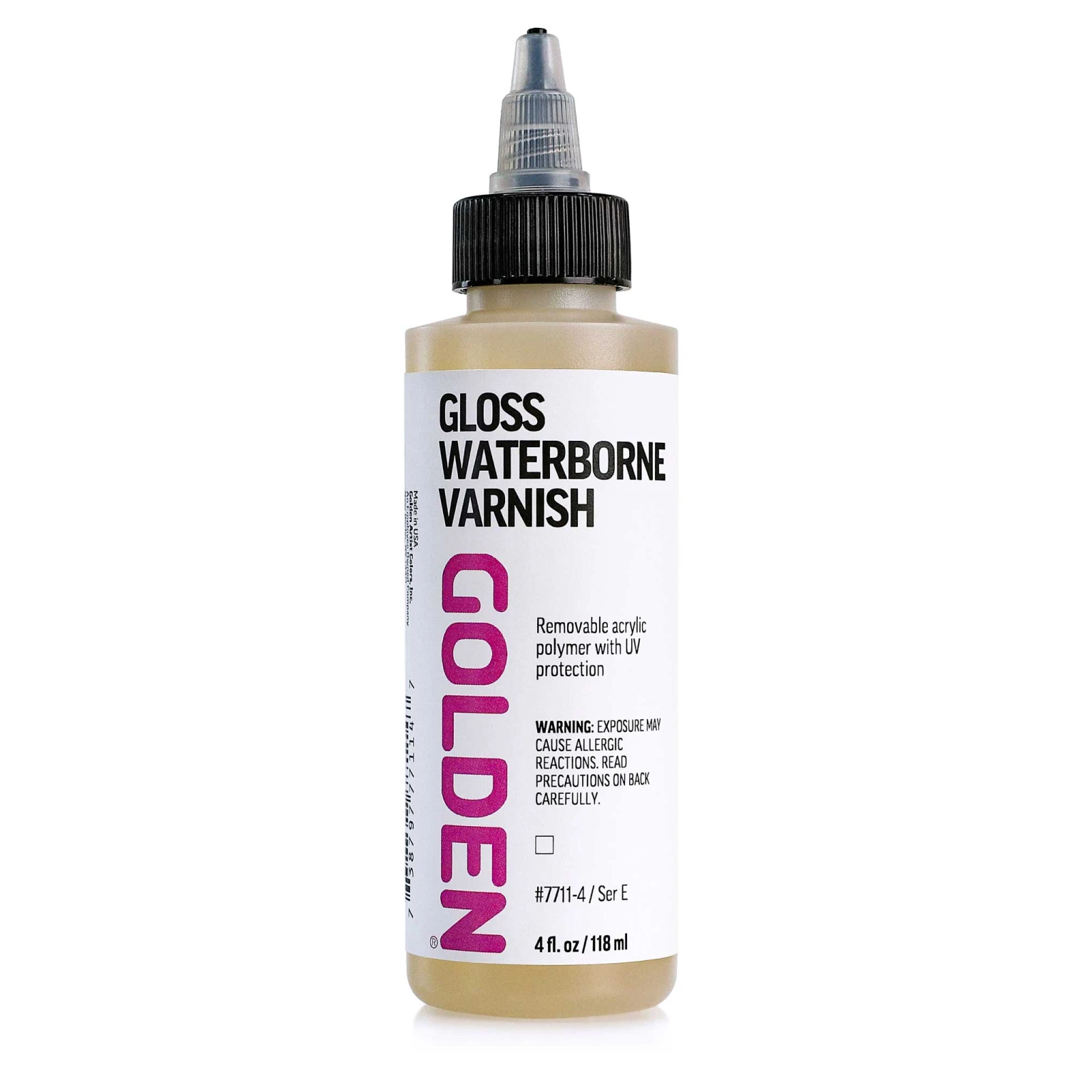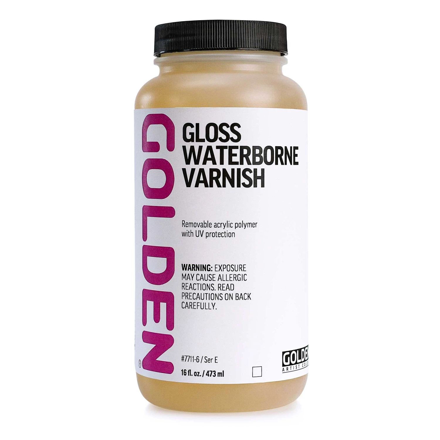 GOLDEN Waterborne Varnish is for use on interior acrylic paintings and can be applied without the need for harsh solvents for thinning, cleanup or removal, or ventilation and other precautions necessary when working with mineral spirit varnish. May be brush or spray applied. Dries glossy and may saturate colour.