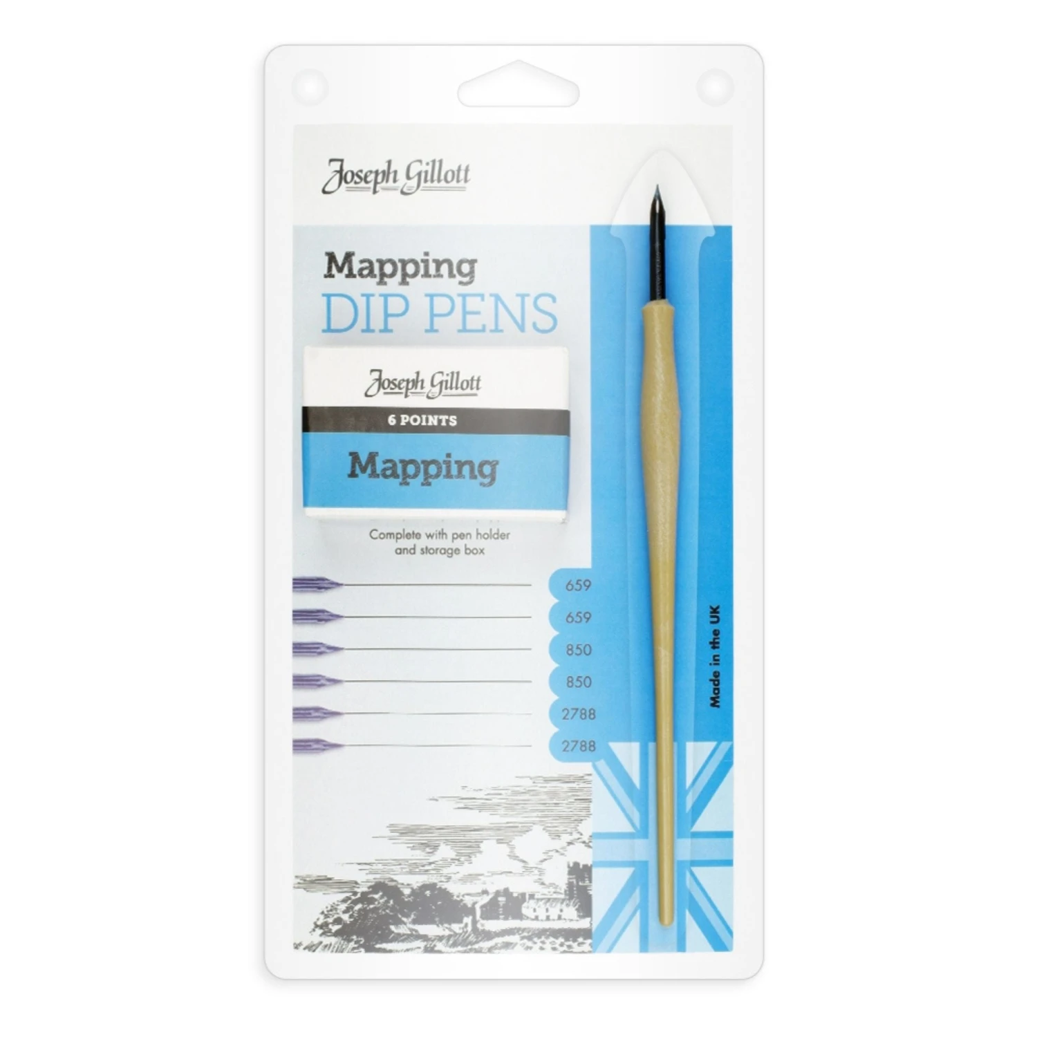 This set of Joseph Gillott Mapping Dip Pens contains two each of 3 assorted mapping nibs, complete with pen holder and storage box.Â