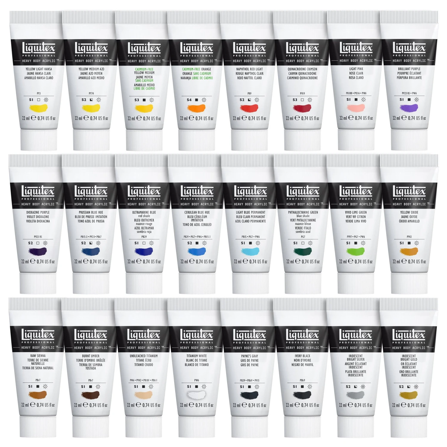 Liquitex Heavy body acrylic is high viscosity professional acrylic. With a high concentration of lightfast* fine art pigment and a vibrant satin finish, its rich consistency holds crisp brush strokes and knife marks. This set brings together a selection of core colours to help you build your base palette.