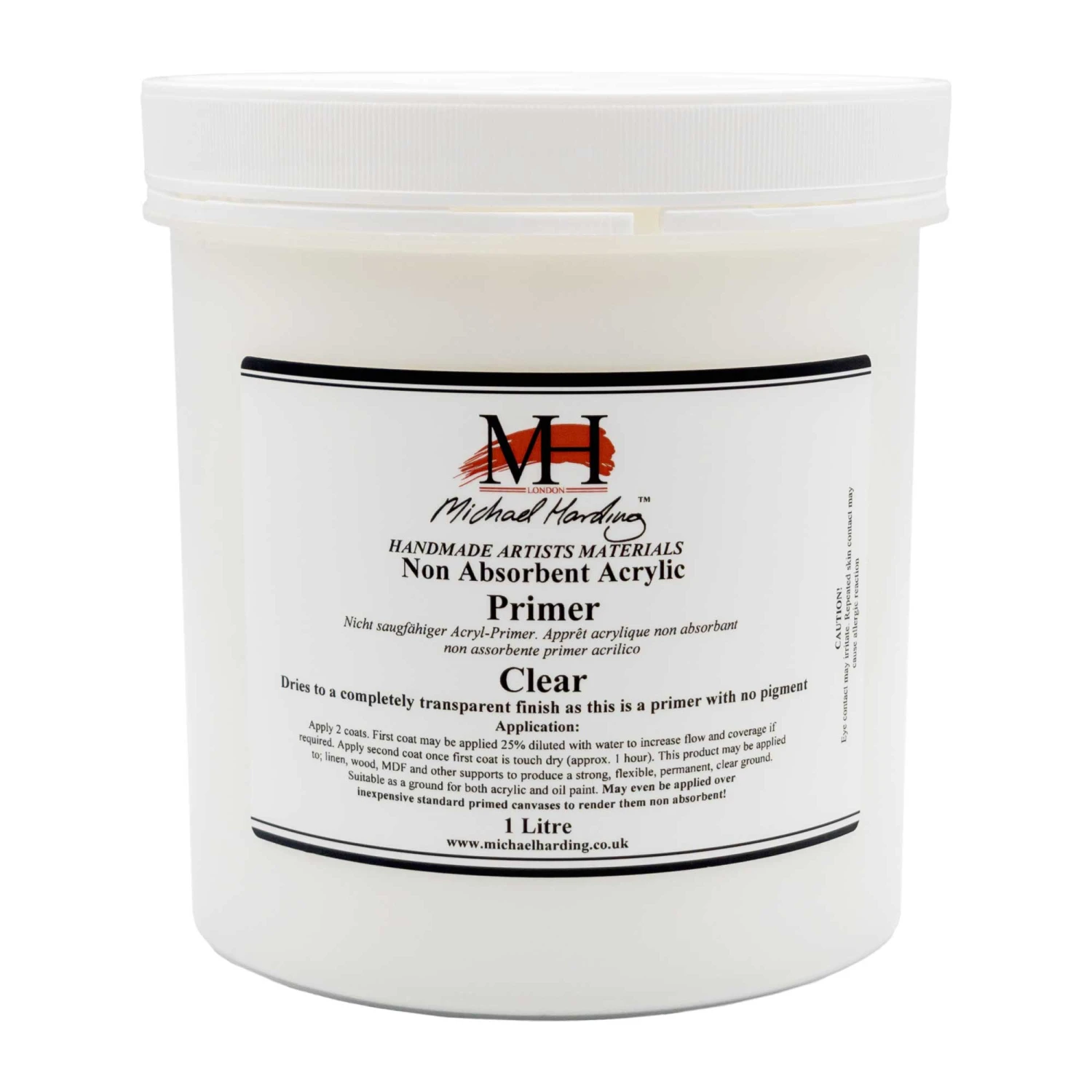 Michael Harding Non-Absorbent Clear Acrylic Primer is designed to be applied to a coloured surface where the artist wishes to preserve or enhance a supports’ natural colour — such as raw linen or wooden panels. The support will become slightly darker because of the Clear Transparent NAAP application.