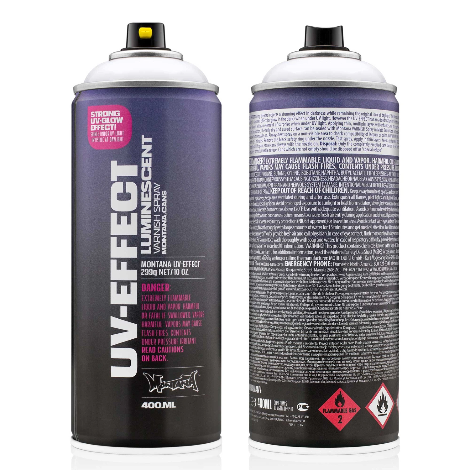 Applying in thin, multiple layers will enhance and increase the UV EFFECT sprays ability to produce a vibrant glow effect. To add durability and protection, the fully dry and cured surface can be sealed with Montana VARNISH Spray in Matt, Semi-Gloss or Gloss. Always test spray on a non-visible area to check compatibility of lacquer or paint.