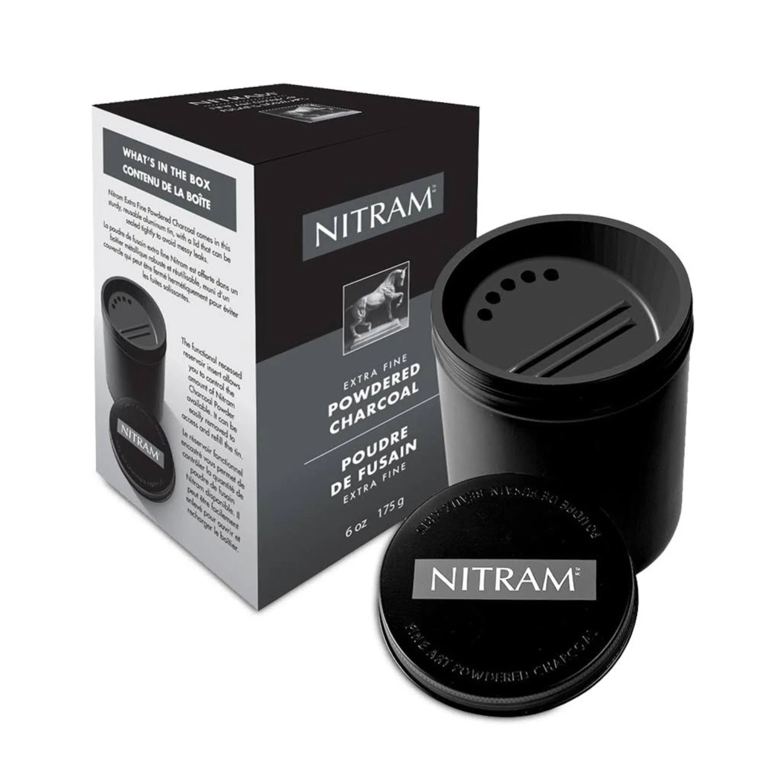 You can use a brush or a paper stump to create shapes and tones quickly and easily. Nitram Powdered Charcoal comes in a sturdy, reusable aluminium tin with a lid that can be sealed tightly to avoid messy leaks.