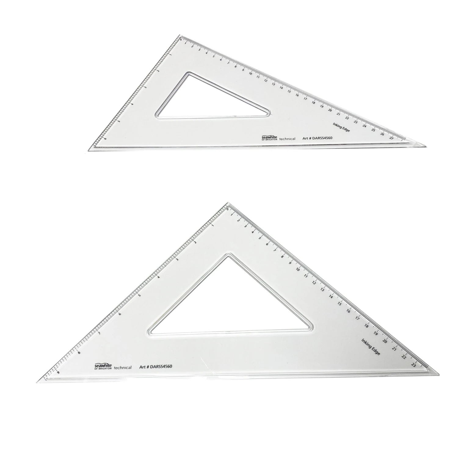 These set squares from Seawhite of Brighton are made from a clear plastic and are engraved in inches and centimetres. They come in a set of two, and both feature an inking edge.